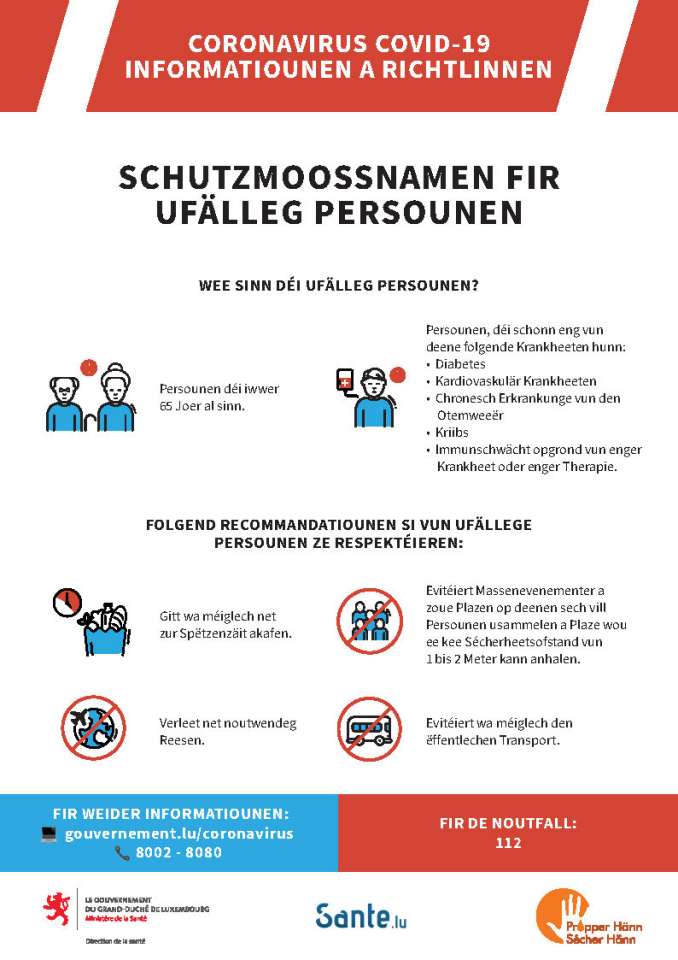 Um offizielle Site www.covid19.lu fannt Dir all d’Informatiounen zum COVID-19-Coronavirus wéi zu sengem Symptomer, senger Iwwerdroung an de richtege Moossname fir Ären eegene Schutz wéi och fir dee vun all de Leit aus Ärem direkten Ëmfeld.